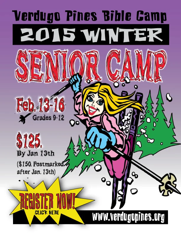 Senior Winter Camp Friday, February 13, 2015 12:00 PM 12:00 Monday, February 16, 2015 2:00 PM 14:00 Google Calendar ICS If you are interested in signing up for Winter Camp at Verdugo Pines, please contact Naomi Rainey. Scholarship opportunities are available.